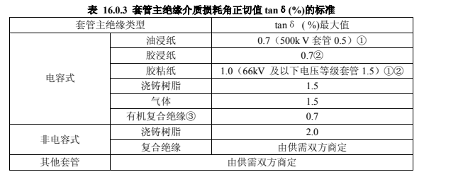 2.應(yīng)在分閘狀態(tài)下測量每只套管的 tanδ 。當(dāng)測得值超過標(biāo)準(zhǔn)時,應(yīng)卸下油箱后進(jìn)行分解試驗(yàn),此時測得的套管的 tanδ (%)值,應(yīng)符合本標(biāo)準(zhǔn)表 16.0.3 的規(guī)定。