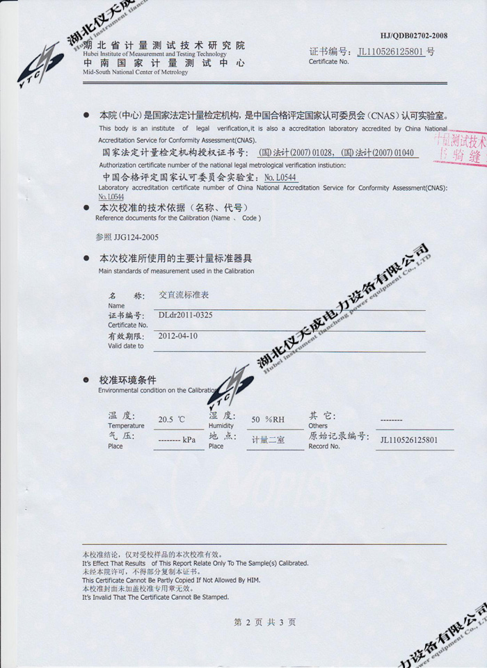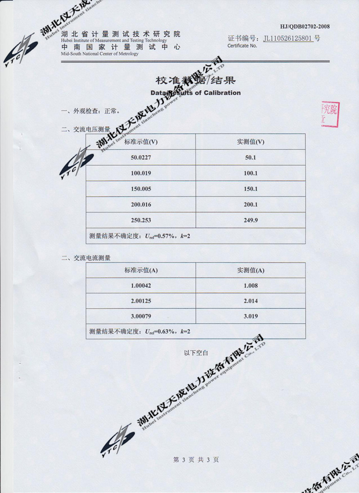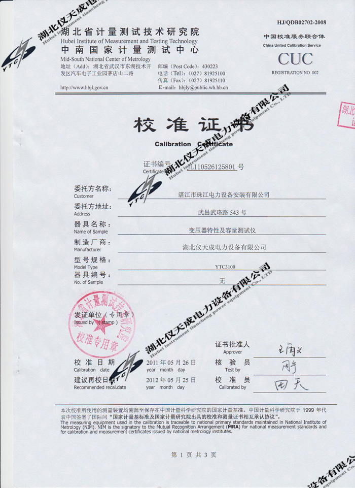轉載:"YTC3100變壓器特性及容量測試儀的資質證書" 請注明來源于儀天成電力。 更多技術問題請致電儀天成電力客戶服務:027-87876585,技術部專線:027-87876585,在線客服:719388481